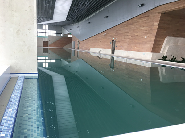 而针对该泳池的水处理系统,联盛泳池工程公司除了采用臭氧及在线长效氯进行消毒以外,还配备了多功能除湿热泵,确保为每一位游泳者提供舒适、洁净的畅泳环境。